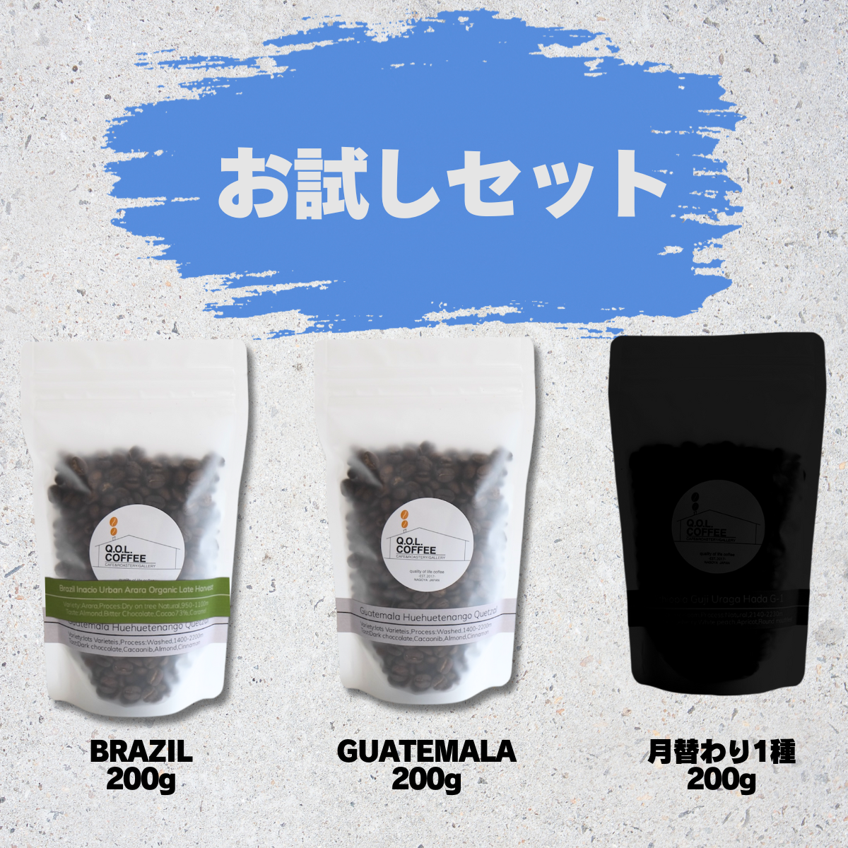 スペシャルティコーヒー初心者の方にもお試しいただきやすいセット内容となっております。 定番のコーヒー豆が2種類と月替わりの1種類が各200g入ったお試しセットです。