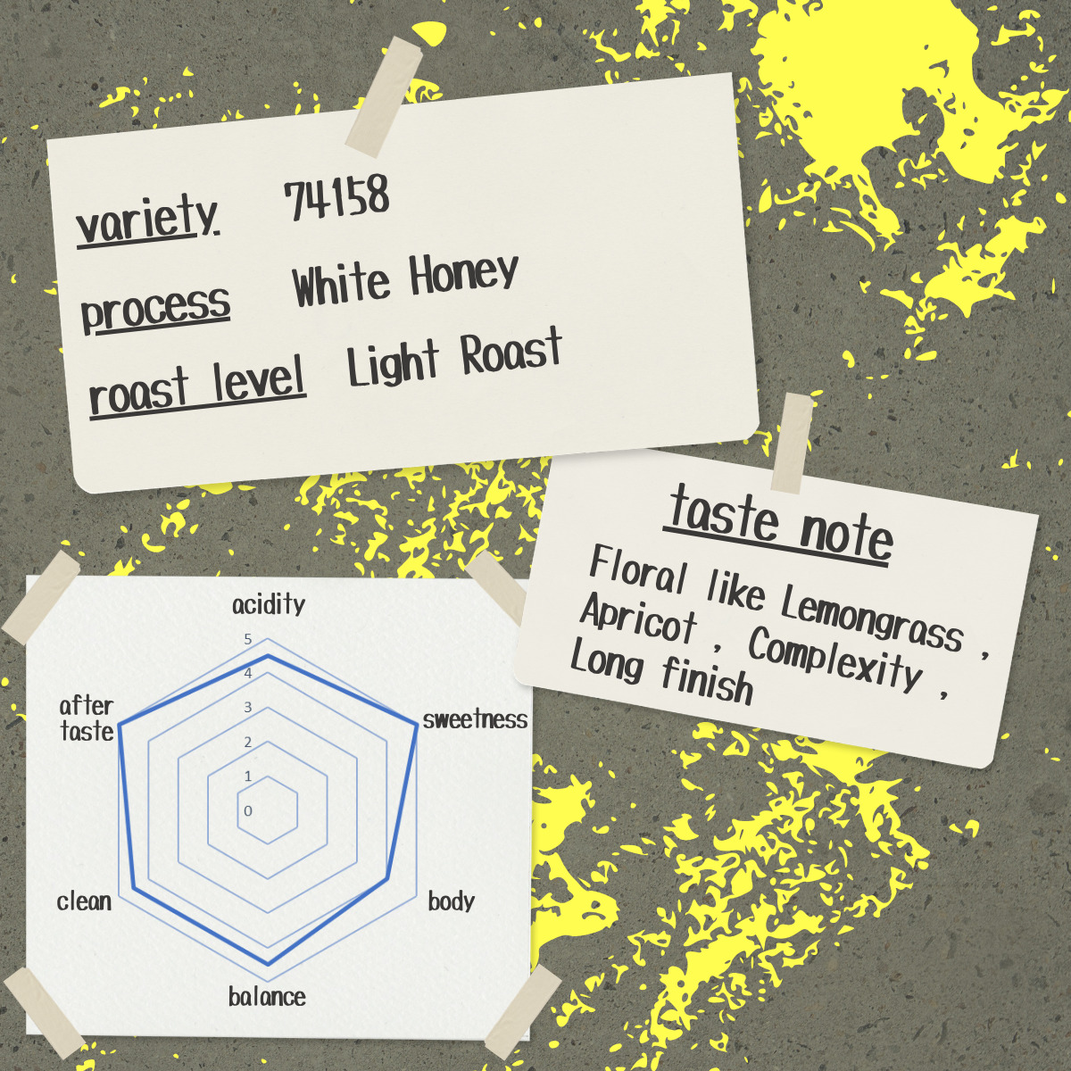 CUP:Floral like Lemongrass , Apricot , Complexity , Long finish日本未入荷のエキゾチックなプロセスを使用した、本企画限定ロットです。